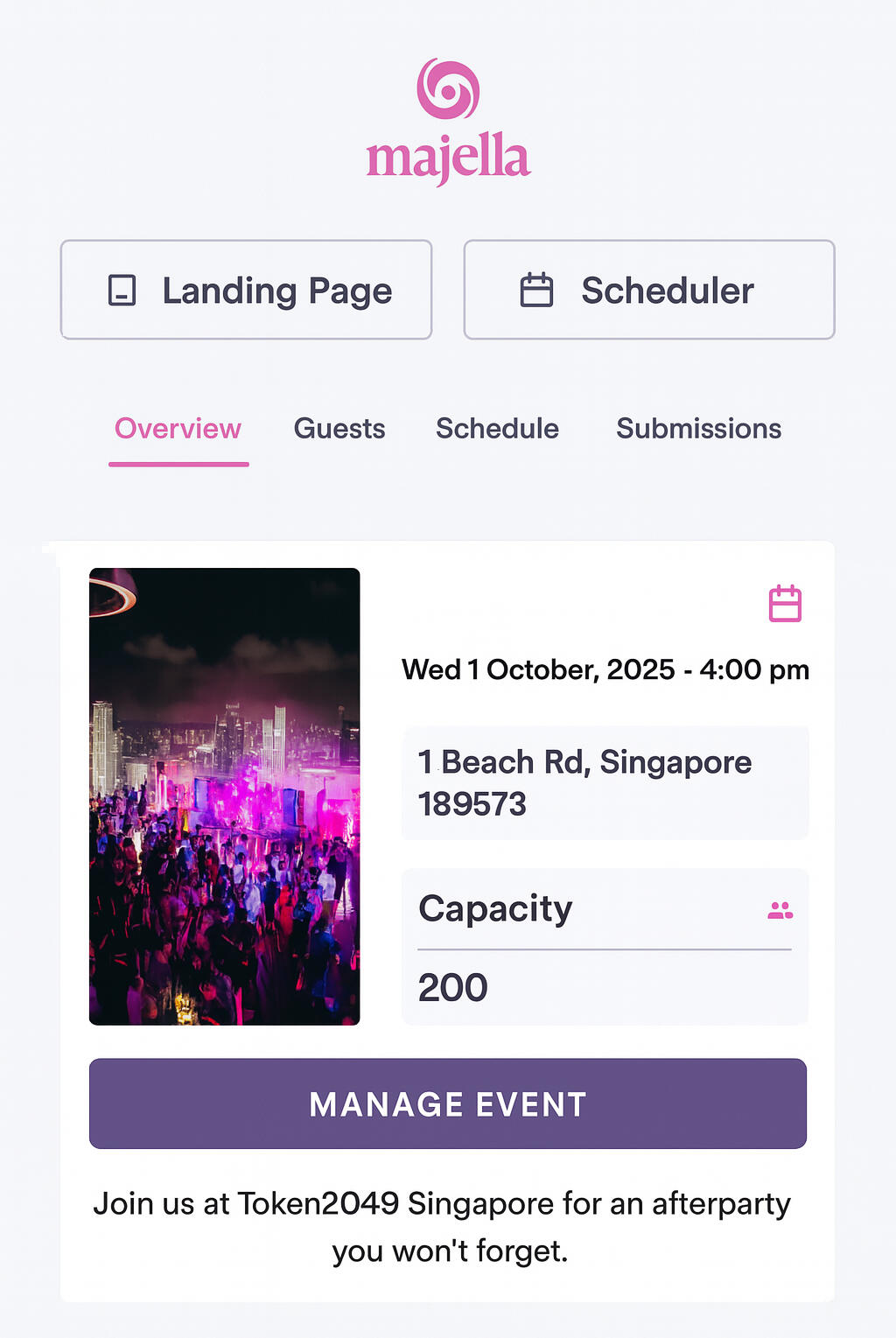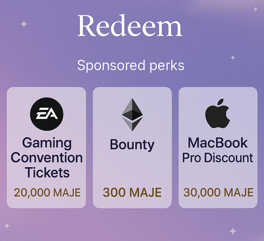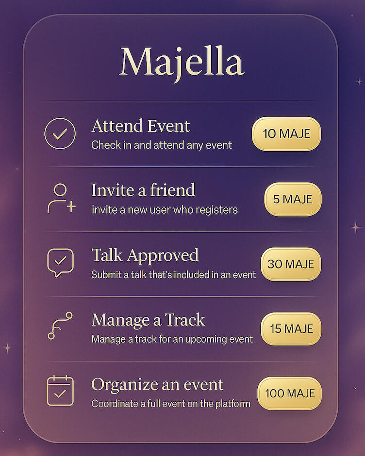Rack up MAJE points for meaningful participation. Big or small, every action earns, from checking in to being keynote at a conference or answering a live poll to running the show. Majella tracks it, and rewards it.